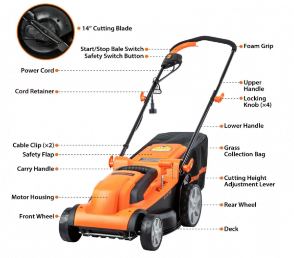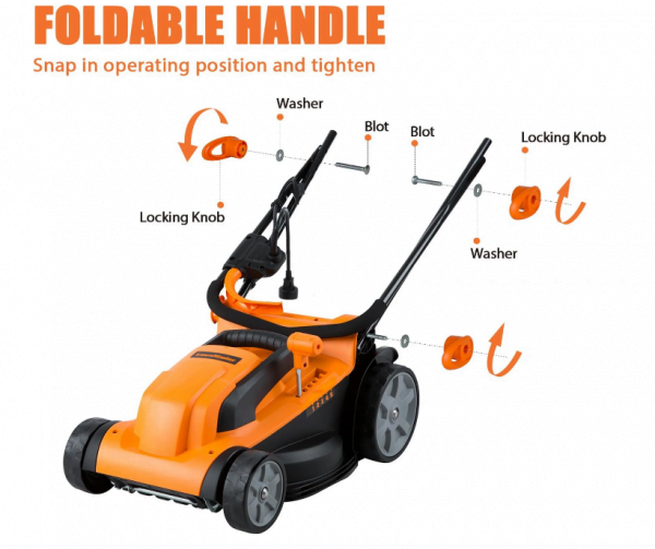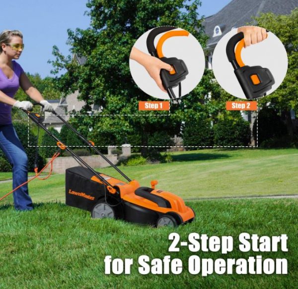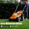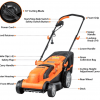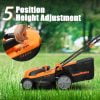 The Electric Lawn Mower boasts a 14-inch cutting width and a robust 11AMP motor delivering 3300RPM for high efficiency. Its 15-inch rust-resistant deck ensures durability. Offering 5 cutting positions ranging from 11.4″ to 3″, it features a one-touch height adjustment lever for convenience.
